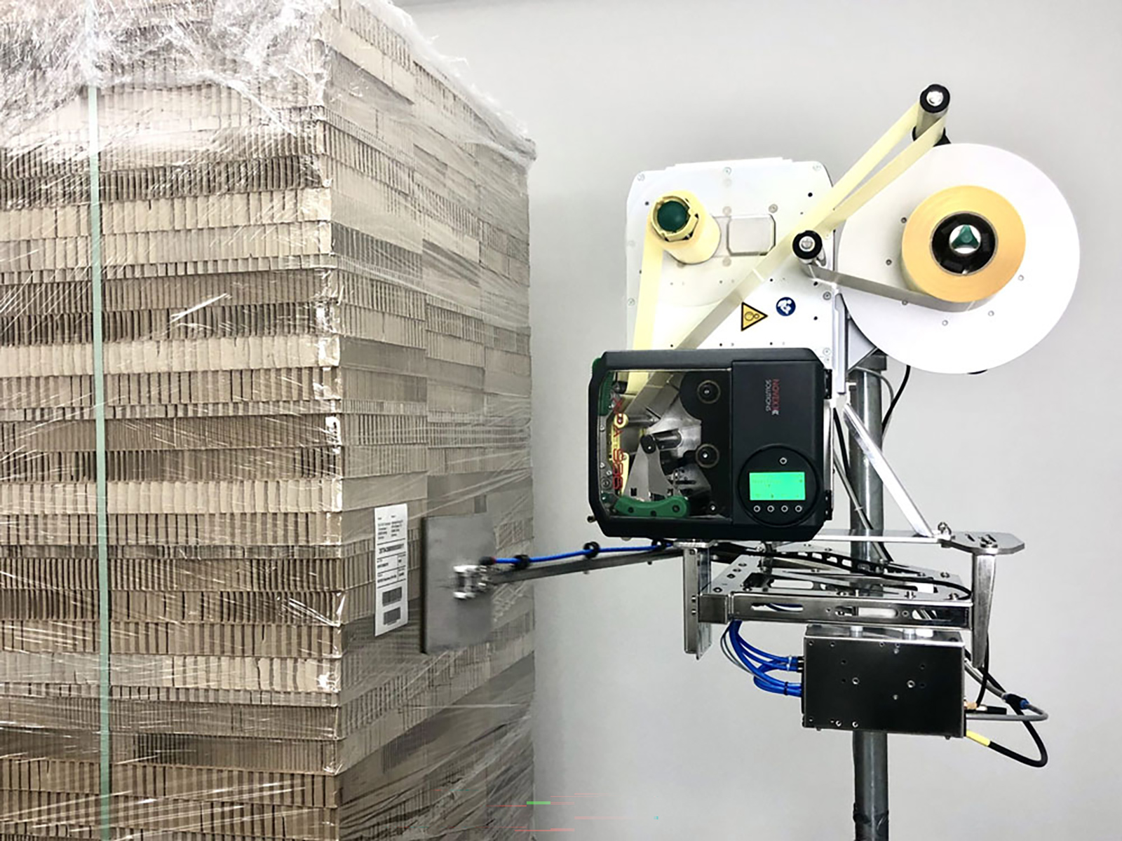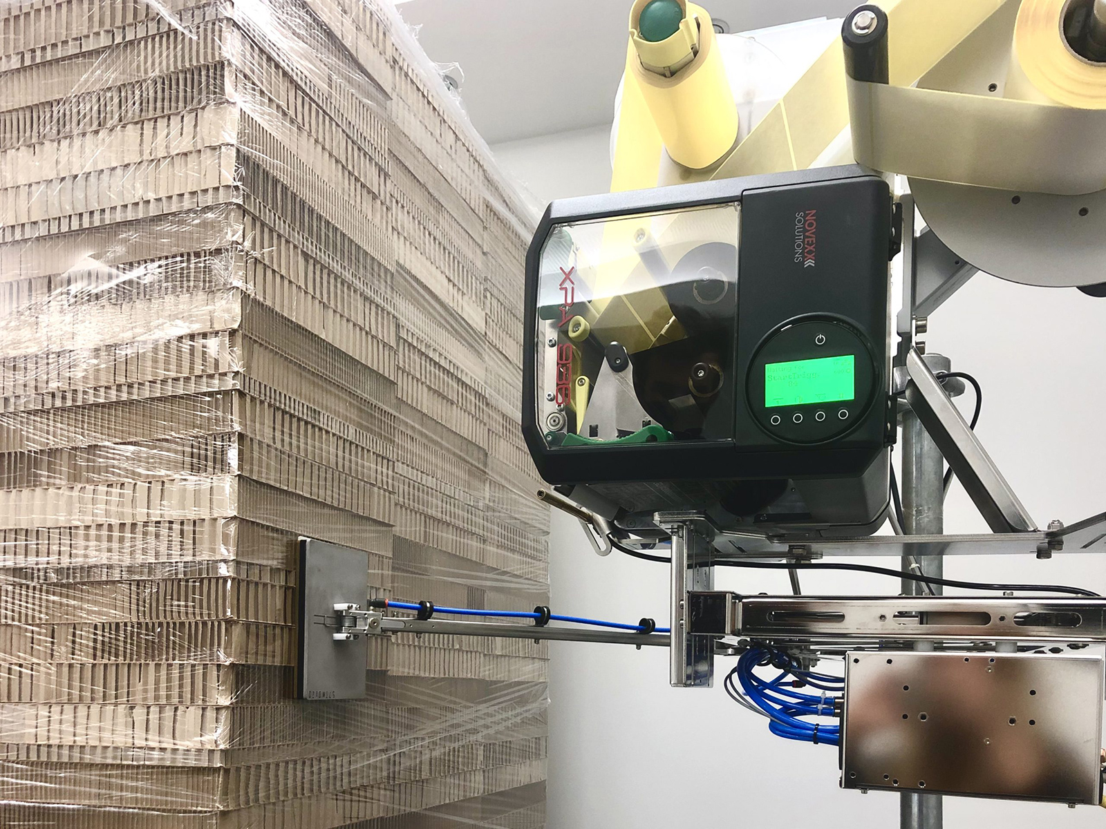 Aplikace paletové etikety pomocí ramene aplikátoru