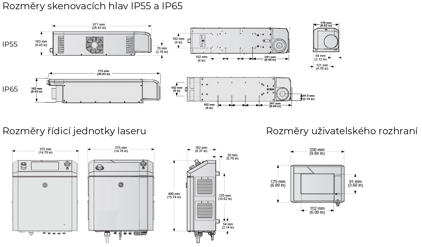 | Hmotnost laseru: | řídicí jednotka 10,2 kg, uživatelské rozhraní 2,1 kg, skenovací hlava 18,5 kg |