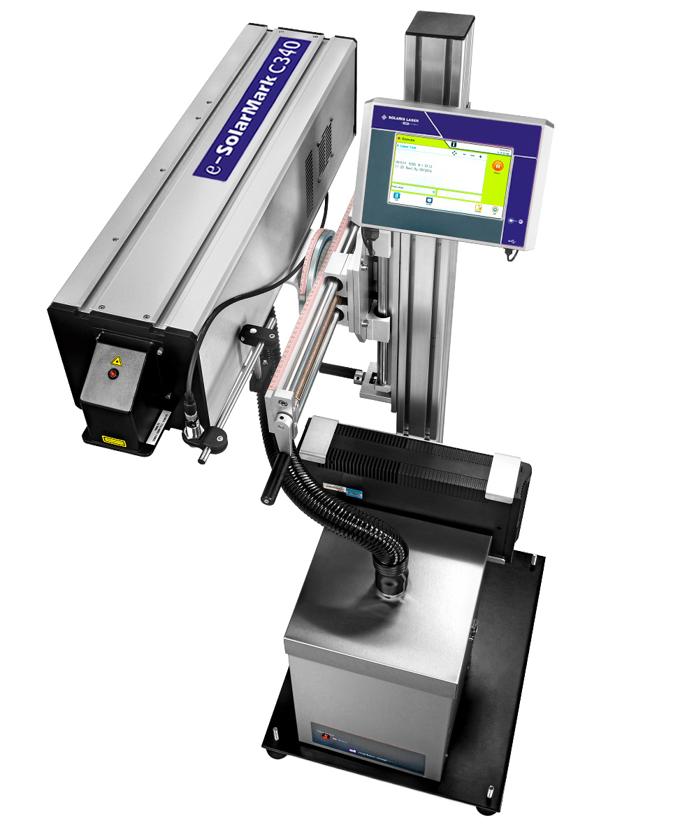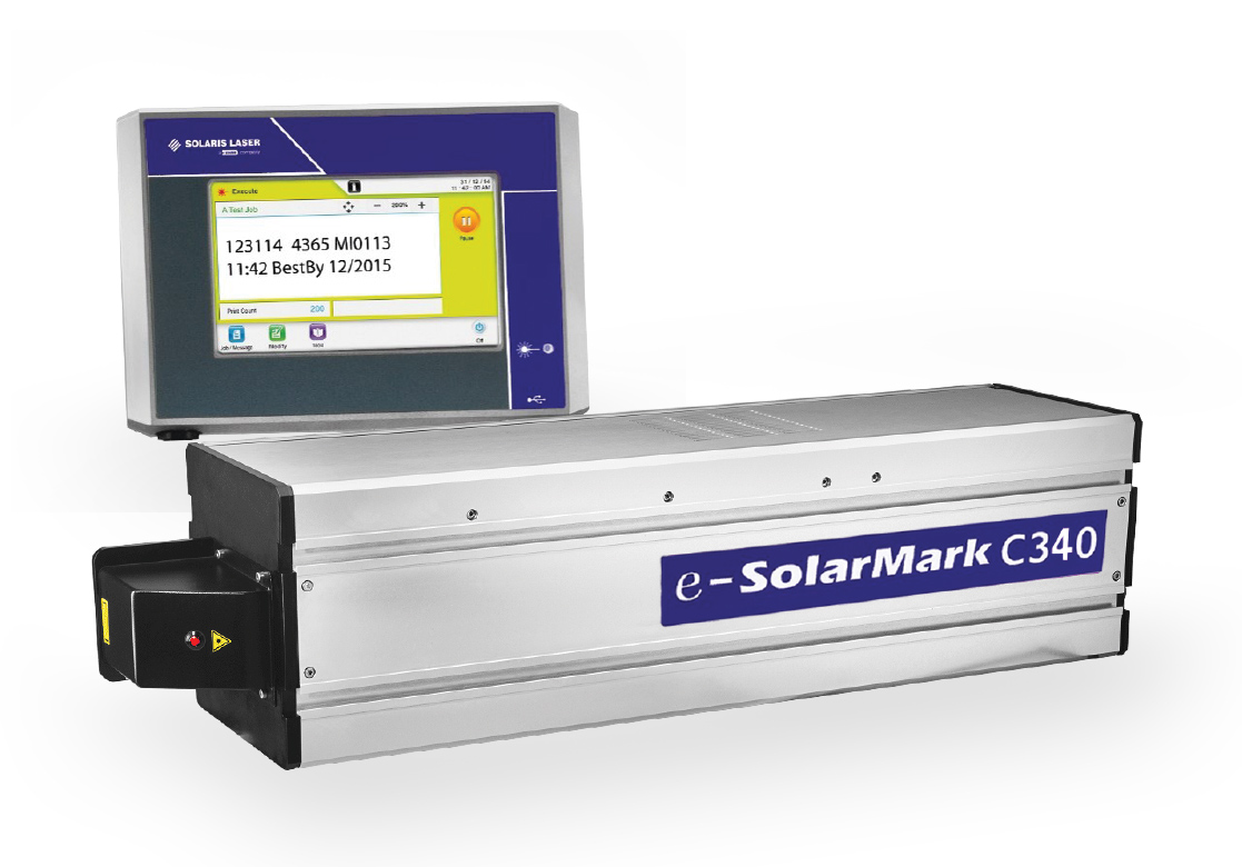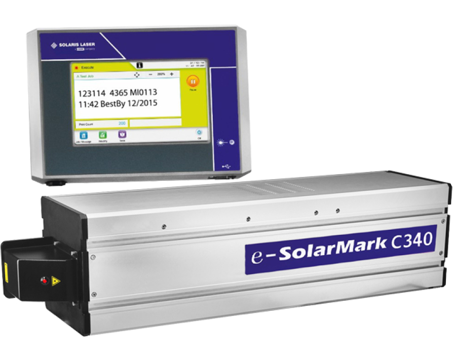 CO2 laserový značí systém e-SolarMark C340 redefinuje standardy průmyslového značení a kódování díky své kompaktní konstrukci typu „vše v jednom“. Systém má krytí IP44 a spolehlivě funguje až do 45 °C. Díky 7“ dotykovému WYSIWYG rozhraní nebo webovému ovládání minimalizuje riziko chyb obsluhy a maximalizuje produktivitu výrobní linky.